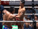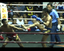 タノンチャイ以外は敵が見当たらないセーンマニーの相手に大抜擢されたのはTVマッチを中心にもっか4連勝中だという新鋭チャーンスック。2pハンディを 貰いながらもどういった戦いを魅せるのか注目されたが、、、1Rジャンピングしての前蹴りでセーンマニーを蹴り上げるチャーンスック。しかしこれがセーン マニーに火をつけてしまった!? チャーンスックのその細い足をセーンマニーはローキックで狙い撃ち。2Rで既に効いてしまうチャーンスックは3Rローを 蹴らせまいと接近戦に持ち込む。しかし逆にセーンマニーのヒザをボディーに連発され崩れ落ちる。見事KOで圧倒的な実力差を見せつけた。(K.M)